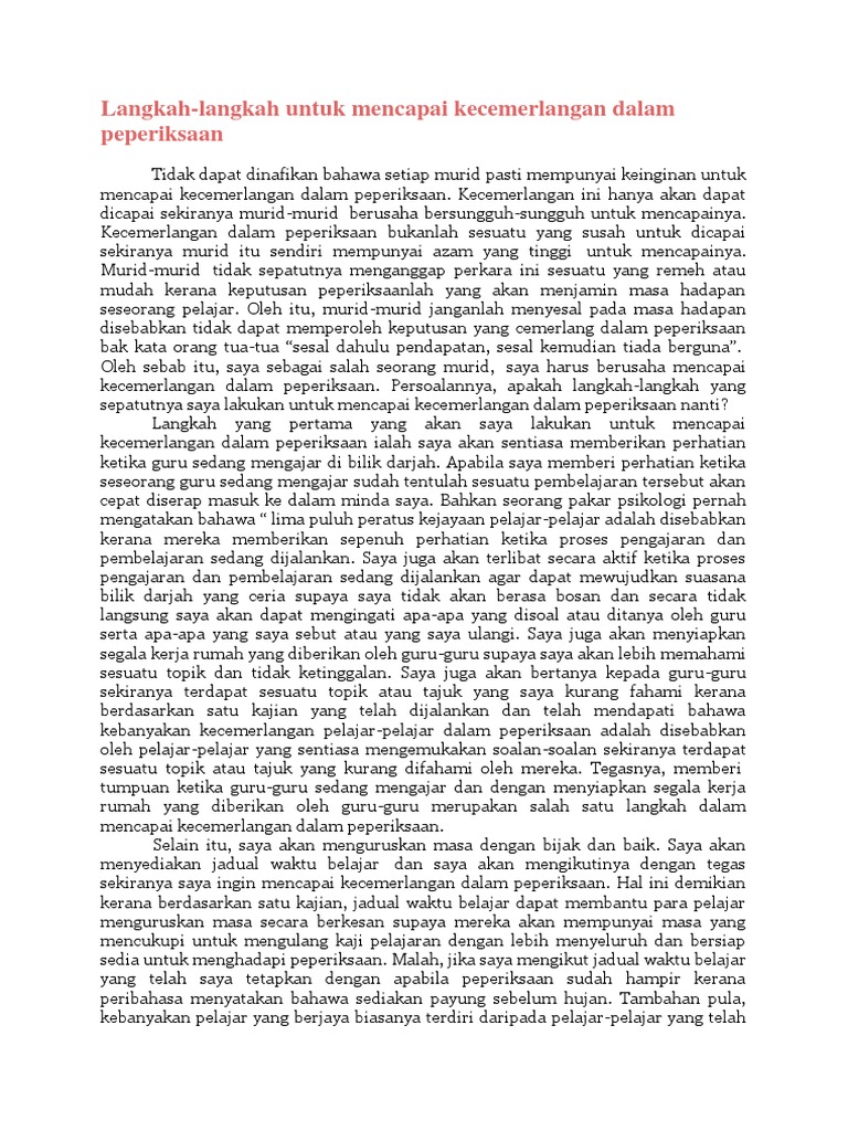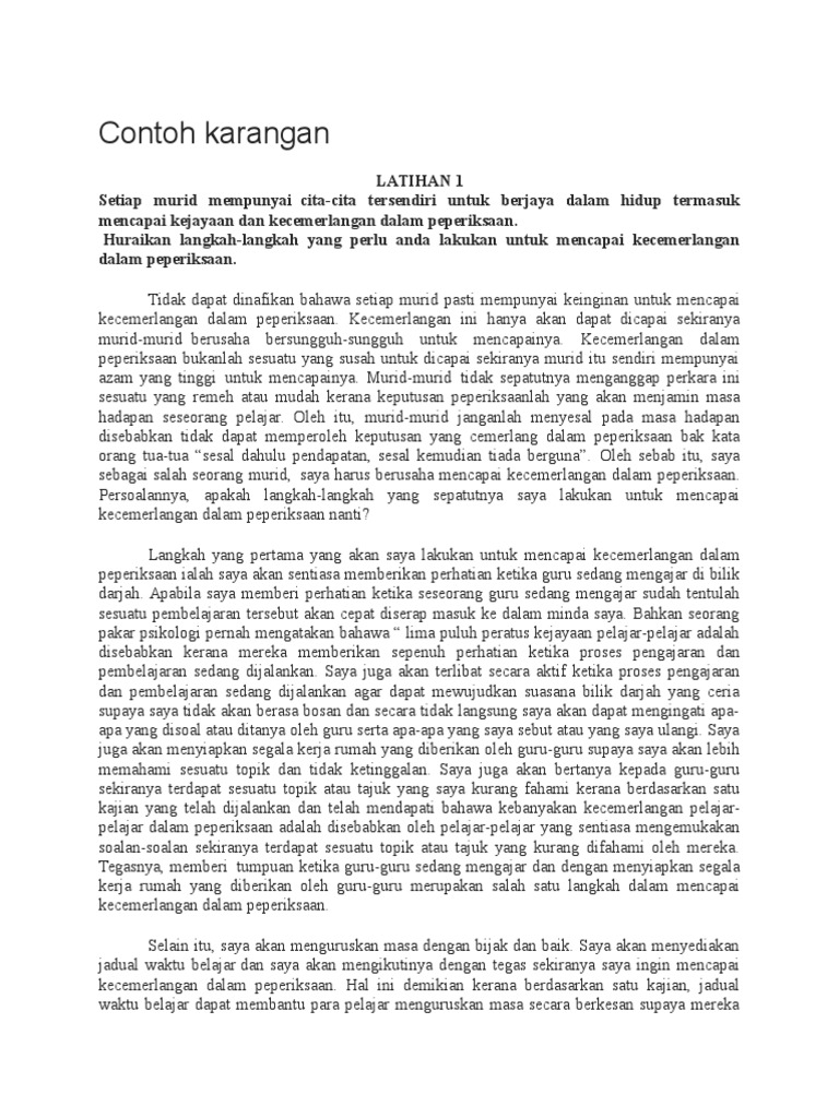 Contoh Karangan Bahasa Melayu BM Tingkatan 1 2 3. Setiap individu mempunyai wawasan untuk mencapai cita-citanya. Usaha untuk mencapai kecemerlangan akademik.